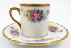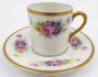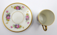 Německo, Selb, 20. léta minulého století. Bílý, barevný a zlacený porcelán. Porcelánka Rosenthal. Výška šálku 4,5 cm, průměr podšálku 10,5 cm. Kávový šálek z bílého porcelánu dekorovaný barevnými kyticemi a zlacenými linkami. Značeno zespodu: firemní značka a značka malíře.
