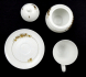 Bílý porcelán, ruční malba zlatem. Autor designu: Bjorn Wiinblad (1918-2006) dánský malíř a designér. Modelér: Hans Wohlrab (1905-1978). Název modelu: Romanze (Romance). Číslo modelu: 1250. Prvně tento servis vyrobila světoznámá porcelánka Rosenthal v roce 1959. Servis je publikován v knize: Dieter Struss - Rosenthal - Service, Figural, Ornamental and Art Pieces na straně 94 v obrazové příloze, vydalo: Schiffer Publishing Ltd., USA. Jeden ze šálků má uvnitř nepatrnou vlasovou prasklinku, jinak je ve vynikajícím stavu. Značeno zespodu: zelená značka Rosenthal Germany, ručně zlacený nápis Handgemahlt, značka malíře 3621 a originální papírové štítky kontroly kvality (málo vídané či dochované). Německo, Selb 1959 - 1968. Výška konvice na kávu s víkem 21 cm, výška konvičky na mléko 7 cm, výška cukřenky 8 cm, výška šálků 6 cm, průměr podšálků 12 cm.