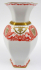 Německo, Selb, rok 1931. Bílý, barevně ručně malovaný a zlacený porcelán. Porcelánka Rosenthal s datací výroby 1931. Výška 20 cm. Porcelánová šestiboká váza se silným zlacením horního i spodního okraje a silnou zlatou linkou na těle vázy. Pás ručně červeně a zlatě malovaných medailonů s florálními ornamenty a zlacenými květinovými girlandami. Značeno zespodu: firemní zelená značka Rosenthal Bavaria platná pro rok 1931, červené písmeno R s korunkou (označení používané od roku 1930) a malířská značka.