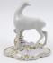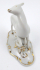 Československo, Duchcov 1960 - 1978. Bílý a ručně zlacený porcelán. Royal Dux, Duchcov. Výška 11 cm, rozměr podstavce 10 cm x 5,5 cm. Porcelánová figurka srnky s ladně natočenou hlavou na stranu a zdviženou přední nohou umístěná na stylizovaném zlaceném podstavci. Značeno zespodu: modrá značka výrobce a vtlačená čísla.