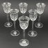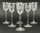 Čechy 1925 - 1935. Bezbarvé ručně broušené tenkostěnné sklo. Období a styl: art deco a prvky vídeňské secese. Haida (Nový Bor) nebo Steinschönau (Kamenický Šenov) nebo Alois Metelák (1897-1980) spolu se studenty tehdejší Státní odborné sklářské školy v Železném Brodě. Ovlivněno tvorbou slavného vídeňského architekta a designéra Josefa Hoffmanna (1870-1956). Zvláště jeho návrhy mušelínového nápojového skla pro firmy J. & L. Lobmeyer, které byly často vyráběny v Čechách. Výška 13 cm. Sada šesti skleniček na likér s kupou ve tvaru kalichu zdobená ručně broušenými hvězdičkami a kometami. Stylová profilovaná vysoká nožka zakončená kulatou patkou.