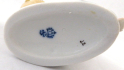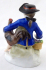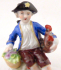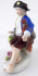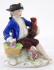 Bílý, ručně barevně malovaný a zlacený porcelán. V rokokovém stylu. Sitzendorfer Porzellanmanufaktur, Sitzendorf, Německo. Porcelánová soška sedícího chlapce držícího kohouta v levé ruce, pravá ruka spočívá nad ošatkou s květinami. Oválný rokokově tvarovaný podstavec se zlatými konturami. Značeno zespodu: modrá koruna, písmeno S, číslo malíře. Německo, od roku 1918. Výška 7 cm, šířka 6,5 cm.