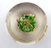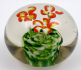 Čechy 1910 - 1940. Bezbarvé a barevné sklo, leštěné. Výška 6 cm, průměr 8 cm. Skleněné těžítko klenutého kulatého tvaru, uvnitř se třemi barevnými kvítky v červené, bílé a zelené barevnosti. Vhodný dárek na pracovní stůl.