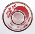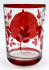 Čechy 1850 - 1890. Čiré sklo, rubínová lazura, bílý email, ruční malba a zbytky zlacení. Výška 12 cm. Sklenice z čirého skla s rubínovou lazurou s oválným medailonem a motivem ptáčků ve větvích s ručně bílým emailem malovanými lístky. Horní okraj sklenice zdobí zčásti setřelá zlacená linka.