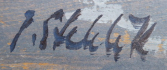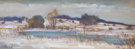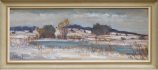 Olej na kartonu 27 x 70 cm. Signováno vlevo dole. Autor: Jindřich Stehlík (1905-1991). Formátově zajímavý obraz s námětem poprašku sněhu na jihočeských blatech. Dobový světlý rám. Vzadu na kartonu žertovný autoportrét malíře. Československo 1965 - 1980. Celkový rozměr s rámem 36 x 79 cm.