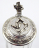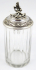 Německo, Geislingen, kolem roku 1923. Postříbřená mosaz - alpaka, bezbarvé broušené sklo. Výrobce víka s úchytem: Württembergische Metallwarenfabrik (WMF), Geislingen. Skleněný korbel s broušenými svislými fazetami a postříbřeným víkem s okružím. Centrální část víka dekorovaná reliéfními kuželkami. Okraj s gravírovanými a gilošovanými ornamenty spolu s gravírovaným věnováním v němčině, přeloženo jako: Panu Hugo Burkhardtovi věnováno od Bergclubu Gera (sportovní kuželkářský klub) s datem 28.12.1923. Úchyt zakončen figurou lva držícího štít či erb. Značeno: firemní značka WMF, písmeno N (Neusilber, I/0 síla postříbření a značka X (oxidující).