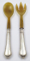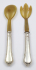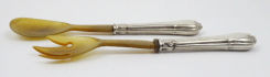 Německo 1870 - 1900. Stříbro, rohovina. Ryzost Ag 750/1000, celková hmotnost 150,35 g. Přiloženo osvědčení Puncovního úřadu České republiky. Délka vidlice 26,5 cm, délka lžíce 25,5 cm. Příbory na salát se stříbrnou rukojetí zdobenou reliéfními linkami, pletenci a symbolem trojlistu. Horní části z rohoviny. Značeno: ryzost 750.
