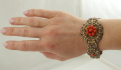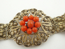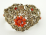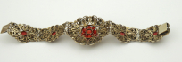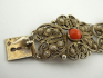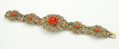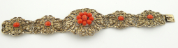 Estonsko 1922 - 1940. Stříbro, přírodní mořské korály. Ryzost Ag 875/1000, celková hmotnost 36,27 g. Délka 180 mm, šířka 38 mm. Stříbrný náramek s výjimečnou ukázkovou prací šperkařské techniky ornamentu filigránu zdobený pravými středomořskými korály. Značeno zespodu: estonské puncy, nově označeno platným českým puncem a ryzost 875.