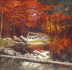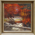 Československo, rok 1932. Olej na plátně 90 cm x 90 cm. Signováno vpravo dole s datací 1932. Autor obrazu: Josef Svoboda (1901-1945). Celkový rozměr s rámem 112 cm x 112 cm. Imprese barev s náladou podzimního dne s bystřinou protékající lesem. V originálním širokém klenutém rámu se stříbrnou patinou.
