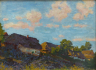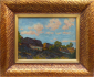 Československo, rok 1921. Olej na kartonu 25 cm x 34 cm. Signováno vpravo dole s datací 1921. Autor: Josef Tesař (1898-1953). Celkový rozměr 41 cm x 50 cm. Impresionistická olejomalba malých stavení rozložených ve stráni za polojasného letního dne. V širokém reliéfním zlatém rámu.