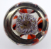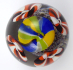 Čechy 1910 - 1940. Bezbarvé a barevné sklo, leštěné. Výška 7,5 cm, průměr 8 cm. Skleněné těžítko klenutého tvaru kopule, uvnitř se čtyřmi bílými, červenými a hnědými pruhovanými květy. Centrální kulatý modrý, žlutý, zelený květ.