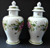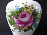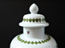 Bílý glazovaný porcelán s květinovým dekorem. Tělo vázy dole projmuté, s kulatou podstavou, rozšiřujícím se středem-centrálním motivem rozkvetlé růže s drobnými kvítky po celém obvodu, nahoře zúžená do úzkého hrdla. Dole a nahoře pás zelených listů. Odjímatelné kulaté víčko přesahující, s vypouklým středem a úchytem ve tvaru čučky, zdobené pásem lístků a drobnými kvítky. Značeno zespodu: značka výrobce. Německo, Unterweissbach, minulé století. Výška 25 cm.