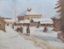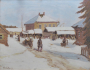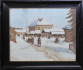 Sibiř 1915 - 1918. Olej na kartonu 44 cm x 58 cm. Signováno vlevo dole. Celkový rozměr s rámem 55,5 cm x 69,5 cm. Autor: Hilar Václavek (1884-1951) český malíř, krajinář, ilustrátor a grafik bojující za první světové války v legiích. Jeho pobyt na Sibiři v Tobolské gubernii ho inspiroval k vytvoření obrazu. Zasněžená vesnice s dřevěnými staveními a pouličním životem s typickými saněmi taženými koněm. Originální černý leštěný rám se zlatou tenkou vnitřní lištou.