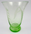 Čechy 1910 - 1930. Uranové ručně broušené sklo. Výška 17,5 cm. Váza z uranového skla kónického tvaru zakončená patkou s efektním prstencem. Dekorovaná ručně broušenými květy konvalinek s listy a úponky.