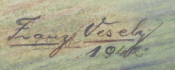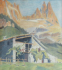 Střední Evropa, rok 1942. Pastel na papíru 32 cm x 28 cm. Signováno vpravo dole s datací 1942. Vzadu originální dobový štítek rámaře. Celkový rozměr s rámem 50 cm x 46 cm. Horský kamenný dům se zábradlím ze dřeva stojící pod siluetami vysokých štítů. V širokém zlatavém rámu.