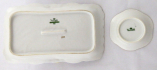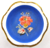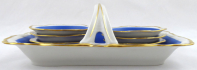 Bílý, modrý, barevný a zlacený porcelán. Porzellanfabrik Victoria, Altrohlau, Stará Role. V historizujícím stylu. Porcelánová souprava sestávající z obdélného košíku s klenutým středovým úchytem a šesti malých kulatých mističek. Zdobené na modrém pozadí barevnými květinami. Zlacené okraje. Značeno zespodu: zeleně Victoria s korunou. Čechy, Stará Role 1938 - 1945. Rozměr košíku 20 cm x 12 cm x 7,5 cm, průměr mističek 8 cm.