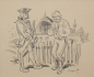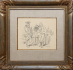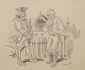 Čechy, rok 1940. Kresba tuší na papíru 15 cm x 18 cm. Signováno vpravo dole s datací 1940. Autor: Jaroslav Vojna (1909-1974) se oženil s vnučkou slavného malíře Mikoláše Alše. Jeho kresby technikou a provedením připomínají Alšovu tvorbu. Celkový rozměr s rámem 32 cm x 34 cm. Císařský voják oslovující potencionálního rekruta před venkovskou chalupou. V originální rámu s tmavou zlatavou patinou a řezbovanými rohy.