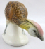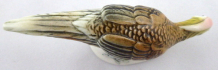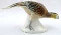 Bílý a barevný porcelán. Aelteste Volkstedter Porzellanmanufaktur. Porcelánová barevná soška stojícího okrasného bažanta se skloněnou hlavou. Sloupkovitý bílý podstavec. Značeno zespodu: modře propletená písmena s korunou a letopočtem 1762, vtlačená čísla. Německo, Volkstedt, minulé století. Výška 4 cm, šířka 10,5 cm.