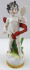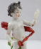 Bílý, ručně barevně malovaný a zlacený porcelán. Aelteste Volkstedter Porzellanmanufaktur. Stojící nahý chlapec s pruhem vlající červené látky spojené zlatým pásem okolo jeho beder. Prohlížející si sám sebe v malém zrcátku, které drží v levé ruce. Vysoký klenutý podstavec se zelenými listy a zlatým ornamentálním spodním pásem. Značeno zespodu: modrá splétaná písmena s korunkou. Německo, Volkstedt 1915 - 1935. Výška 16 cm.