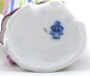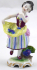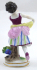 Bílý, ručně barevně malovaný a zlacený porcelán. Porcelánka Volkstedt Rudolstadt založená roku 1762. V rokokovém stylu. Porcelánová soška tančící dívky v pruhované sukni držící v pravé ruce cíp žluté zástěry s položeným hroznem vína. Rokokově tvarovaný kulatý podstavec s hroznem modrého vína s listy. Značeno: modrá písmena s korunou, černě malovaná číslice malíře. Německo, Volkstedt Rudolstadt, minulé století. Výška 10,5 cm.