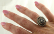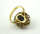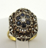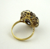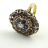 Evropa 1880 - 1910. Osmnáctikarátové žluté zlato, stříbro, přírodní diamant o váze 0,15 ct, šest přírodních safírů. Období a styl: historismus. Ryzost Au 750/1000, celková hmotnost 7,0 g. Velikost prstenu 55-56, rozměr hlavy prstenu 25 mm x 20 mm. Krásný zlatý prsten z období historismu s výraznou hlavou ze stříbra s prořezávaným ornamentem. Ve florálním lůžku hlavy prstenu je centrálně zasazen větší přírodní diamant starého briliantového brusu o váze 0,15 ct, barva G, čistota SI, jehož doplňuje ve formě květu šest přírodních ručně broušených modrých safírů. Originální luxusní ozdoba ruky. Značeno: československý punc kohout a zajíc, mistrovská značka.