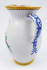 Slovácko, Tupesy, minulé století. Ručně malovaná majolika. Výška 25 cm. Vyšší, tzv. pyskatý, džbán z dílny Oldřicha Úředníčka. Džbán z ručně barevně malované majoliky v tradičním duchu slováckého lidového umění s velkými stylizovanými květy. S žlutými linkami na patce i hrdle doplněnými modrým punktováním. Ucho džbánu dekorováno ornamenty v barevnosti kobaltové modři. Na malé části hrdla vada glazury. Značeno zespodu: vtlačená značka výrobce UTO, vtlačené číslo a ručně černě psaná značka malíře.