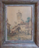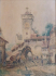 Čechy, přelom 19. a 20. století. Akvarel na papíru 33,5 cm x 25,5 cm. Signováno vpravo dole s nečitelnou datací. Celkový rozměr s rámem 43 cm x 36 cm. Scenérie s postavičkami a koňským povozem pod starodávnou usedlostí s vysokou kamennou věží. V odstupňovaném rámu s patinou, s paspartou a sklem.