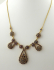 Československo, Turnov, od roku 1957. Zlacené stříbro, přírodní české granáty. Ryzost Ag 900/1000, celková hmotnost 16,20 g. Délka náhrdelníku včetně závěsu 470 mm, výška závěsu 80 mm. Družstvo umělecké výroby Granát, Turnov. Elegantní náhrdelník ze zlaceného stříbra s centrální velkou kapkou lemovanou květinovými tvary s ručně broušenými i reliéfně vrstvenými přírodními českými granáty. Značeno: československý punc zajíc, značka výrobce G2.