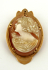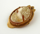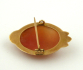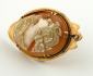 Evropa, první polovina minulého století. Čtrnáctikarátové zlato, přírodní mušlovina. Ryzost Au 585/1000, celková hmotnost 5,85 g. Přiloženo osvědčení Puncovního úřadu České republiky. Výška 39 mm, šířka 25 mm. Oválná zlatá brož v rámečku tvaru kartuše uprostřed s přírodní kamejí z ručně řezané mušloviny zdobené motivem secesního portrétu mladé ženy z profilu.