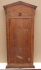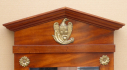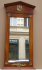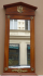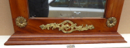 Střední Evropa 1900 - 1930. Dřevo, zrcadlo, mosaz. V empírovém stylu. Rozměr zrcadla: 86 cm x 42 cm x 5,5 cm. Menší zrcadlo zámeckého typu inspirované empírovým stylem. V horní části trojúhelníkového tympanonu originální mosazná ozdoba s motivem orla s trojlistou ratolestí. Odstupňovaná předsazená římsa. Čtyři originální mosazné ozdobné rozety ve tvaru stylizovaného květu růže. V dolní části rokokový mosazný ornament. Profilovaná spodní lišta.